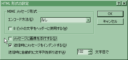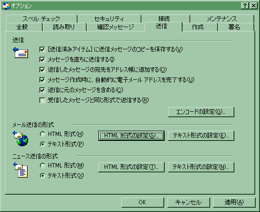 Outlook Express のツールメニューのオプションから「HTML形式の設定」をクリックします。